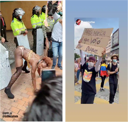 La información recabada a partir de entrevistas de corte feminista (Davis y Craven, 2016) a una de las madres vogueras pionera de la escena en el país, señala la centralidad que durante los meses del Paro tuvieron los performances de Vogue, el cuerpo marica y los atuendos travestis en las revueltas callejeras. Como suele suceder en los conflictos sociales, las personas cuyas vidas atravesadas por marcadores de diferencia interseccionales (Rodó-Zárate, 2021) como la sexualidad, la clase, el género, la raza, el estado serológico suelen ser las más expuestas a ser vulneradas, como lo comprueban las experiencias de esta madre de casa. Sendas publicaciones de la resistencia a través del cuerpo y la sexualidad disidentes se dieron en las plataformas socio-digitales: registros técnicos como videos en historias de Instagram, fotos, textos, íconos, carteles con arengas, etcétera. Una muestra es el video donde vemos a Pantera (imagen 2) confrontar con su trasero a la guardia bogotana. Este desafío vuelto viral en la plataforma funciona ya como declaración política, ya como antídoto ante el malestar, ya como parte de las políticas anales que buscan desmantelar, cuestionar, subvertir, por medio del culo, las desigualdades como la homofobia, el racismo y el machismo (Sáez y Carrascosa, 2011).