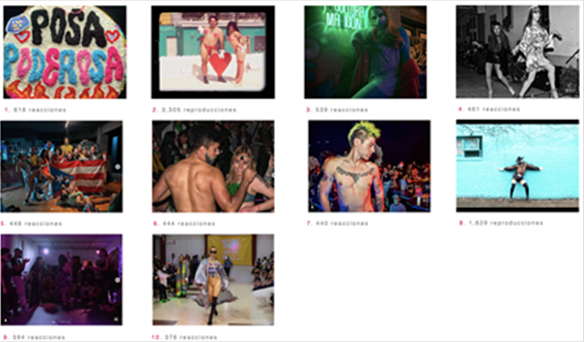 Con el propósito de encontrar patrones he seguido la lógica del engagement (Saeideh et al., 2015) para determinar cuáles son las imágenes con más alto número de reacciones/reproducciones y comentarios. El resultado es visible en la imagen 3, que muestra índices para explorar los datos en términos de performatividad y afectos.
