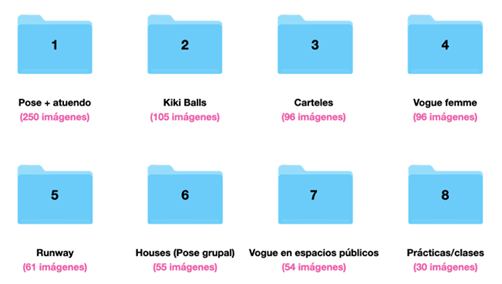 Las diez imágenes que suscitaron más involucramiento de lxs usuarixs, concentran en sí mismas las temáticas que edifican la narrativa de la memoria de la cultura Ballroom. En ellas encuentro una escritura performativa a modo de gramática corporal que ahora es un dato. Al dar lectura a esta composición encuentro secuencias de sentido que originan tendencias a partir de ocho líneas básicas que muestro en la imagen 4. Esta clasificación se legitima al corroborar que es posible ubicar el total de la muestra fotográfica dentro de estas colecciones.