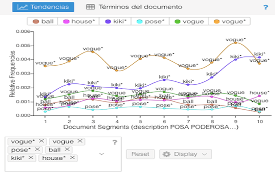 Para poder identificar tendencias y patrones semánticos en los textos recurro a la herramienta de minería textual Voyant-Tools. Algunos autores colocan a este método nativo de la cultura digital a caballo entre lo cuantitativo y lo cualitativo (Moreno y Redondo, 2016). Para hacer un análisis semántico-hermenéutico tomo en cuenta la visualización de los paneles que aportan diagramas de distribución de tendencias y contextos en los que se sitúan las palabras (Imagen 8). Así, encuentro que las parcelas semánticas están guiadas por las siguientes palabras: vogue, kiki, house, ball y pose, dado a su alta frecuencia en las oraciones. A la vez, dichas parcelas encajan con las líneas de sentido con que he organizado el corpus fotográfico en montajes. Siguiendo este hallazgo, puedo decir que los pilares que hacen germinar la cultura Ballroom en Latinoamérica son el performance del Vogue, los eventos pequeños donde compiten las diferentes categorías de Voguing las casas principiantes, la pertenencia a una de las casas donde se agrupan discursivamente las familias y las grandes competencias de ball que reúnen a diferentes escenas y donde se batalla por los grandes premios. En este sentido, no es una cuestión baladí reconocer que en cada una de estas piedras angulares está la noción de un cuerpo colectivo que se mueve y se transforma.