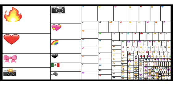 Para visualizar los emojis de la muestra, empleo RAW Graphs para obtener un gráfico de jerarquías (Imagen 9). El emoji que simboliza una llama o fuego es el más frecuente en la comunidad que ha empleado la etiqueta #Ballroommexicano. Es un átomo de cultura digital que simboliza fiereza, fuerza, arrojo, o algo que está en su punto más álgido de ebullición. Esta idea la vinculo con la pose, o el runway como prácticas performativas que dotan a lxs sujetxs de agencia. Colocar esta reacción en las publicaciones de otras hermanas vogueras implica un reconocimiento tanto a su performance como a su identidad disidente.