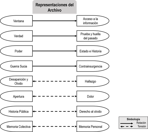 A modo de síntesis de la dimensión mental, se presenta la figura 1, donde se pueden observar las relaciones y contradicciones de las principales representaciones mentales del archivo. En la columna de la izquierda se encuentran los conceptos o procesos que sirven como representación del archivo para los distintos portadores de memoria, mientras que en la segunda columna se anotan las significaciones que poseen. Estas significaciones interactúan de manera diferente, como relación compartida y coherente entre las comunidades del recuerdo o, como tensión y contradicción.
