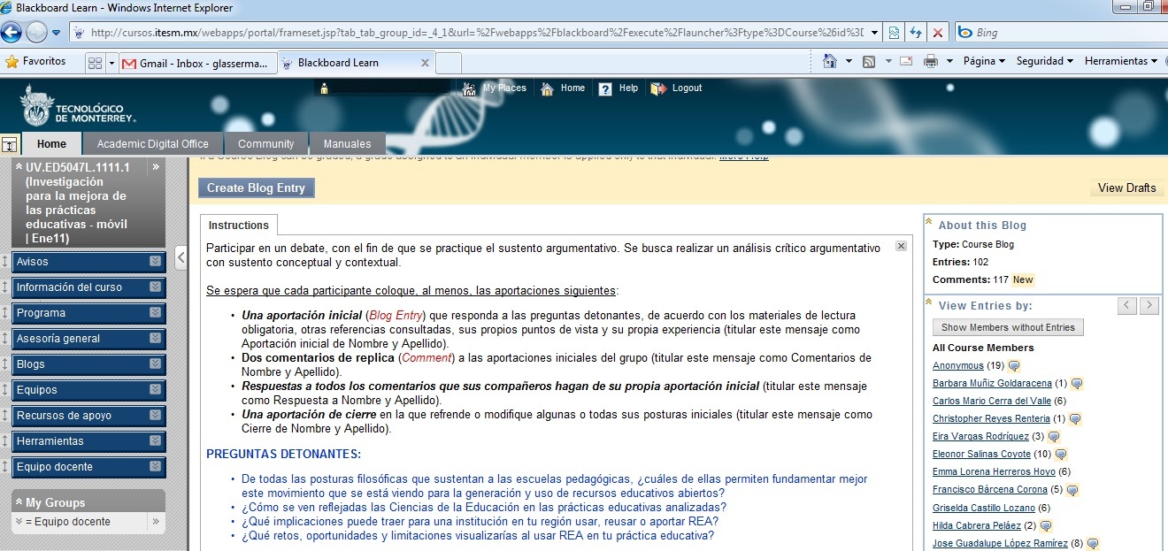 A continuación se presenta una imagen en la que se puede apreciar la distribución del blog dentro del curso en Blackboard (Figura 1).