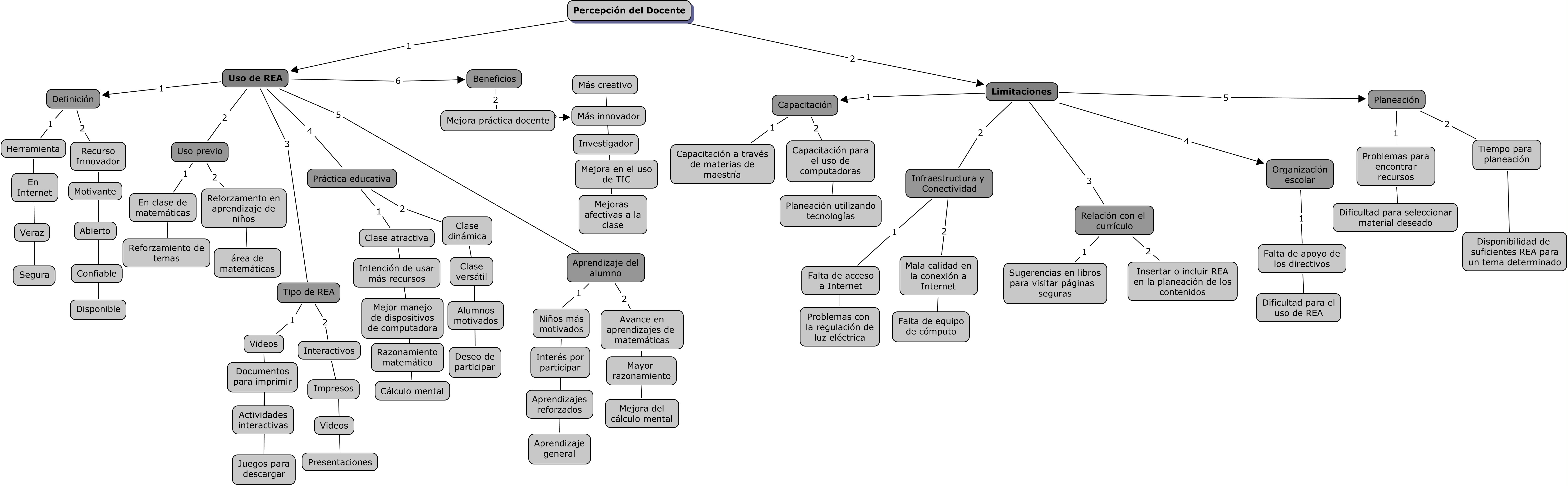 Para una mejor identificación de los casos M y H, la categoría general corresponde a “la percepción de los docentes frente a los REA”. De ese elemento se derivan las dos categorías particulares identificadas como “uso de REA” y “limitaciones”. Respecto a la numeración, en el primer nivel se tienen las dos categorías: 1) uso de REA y 2) limitaciones. Para la categoría “uso de REA” se tienen los dominios: 1) definición, 2) uso previo, 3) tipo de REA, 4) práctica educativa, 5) aprendizaje del alumno y 6) beneficios. Para la categoría “limitaciones” se tienen los dominios: 1) capacitación, 2) infraestructura y conectividad, 3) relación con el currículo, 4) organización escolar y 5) planeación. Para cada dominio se trabajan los términos incluidos de cada caso, 1) para el caso M y 2) para el caso H.
