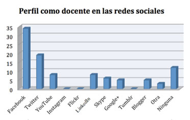 Los encuestados destacaron Facebook como la principal red social. Un 33% lo usó para crear un perfil como docente y para comunicarse con sus alumnos en temas académicos, tanto dentro de la clase como fuera de ella, adaptándose y respondiendo a las características de la sociedad de la ubicuidad actual. Twitter, con un 18%, fue la red social que los docentes establecieron como la segunda utilizada para crear una cuenta como docente y a través de ella interactuar con sus alumnos. Se destaca la tendencia de algunos docentes, un 11%, de no tener ningún perfil dentro de las redes sociales.