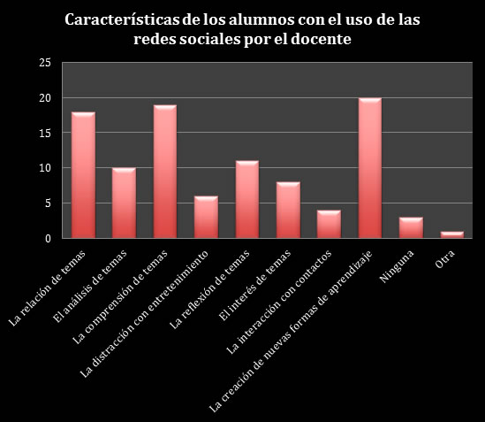 Un 20% de los docentes encuestados respondió que observa que sus alumnos se desenvuelven en la creación de nuevas formas de aprendizaje. Un 18% detectó que con la información en las redes sociales utilizadas en clase, sus estudiantes comprenden los temas que se deben de abarcar. Un 17% de los docentes consideró que sus alumnos relacionan los temas con conocimientos previos. Un 11% de los docentes encuestados manifestó que sus alumnos realizan una reflexión acerca de los temas abordados; el 10% detectó que el uso de la información en las redes sociales les ayudó a sus alumnos al análisis. Sólo un 8% observó el interés por los temas académicos por parte de sus alumnos.
