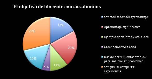 La conceptualización de webnívoro, como el docente que procesa información dentro de la sociedad de la ubicuidad para alimentar al informívoro, se apoya en los siguientes resultados. El 29% de los encuestados respondió que su objetivo como docente, con respecto a sus alumnos, es ser guía al compartir experiencia. Es decir, el webnívoro accede, selecciona, evalúa, crea y comparte información para sus alumnos (los informívoros).