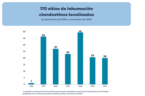Durante En 2022, se registró un incremento significativo en el hallazgo de fosas clandestinas, consolidándose como el año con mayor número de localizaciones en el Estado. Según datos de la Fiscalía Especial en Personas Desaparecidas, se identificaron 41 sitios de inhumación clandestina en ese año, superando las cifras de años anteriores. Durante el 2023, se localizaron 22 puntos de inhumación clandestina en el estado, de donde fueron recuperados 233 cuerpos. Uno de los hallazgos más destacados en 2024 ocurrió en agosto, cuando se encontraron 50 bolsas con restos humanos en una fosa clandestina ubicada en la colonia Paraísos del Colli, en Zapopan.
