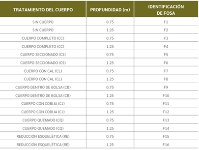 Con relación al diagrama central de trabajo, y con base en la información recabada del análisis de datos, se planteó utilizar 2 profundidades distintas en las fosas que fueron excavadas a 0.75 y 1.25 m respectivamente (Imagen 1). En cuanto a las condiciones en las que se localizaron los cuerpos inhumados de las víctimas (llamados tratamientos) se encontró lo siguiente: cuerpos completos (CC), cuerpos seccionados (CS), cuerpos a los que se les había puesto cal (CL), cadáveres dentro de bolsas (CB), cuerpos envueltos en cobijas (CJ) y reducción esquelética (RE) ((COBUPEJ, 2024). Adicionalmente se agregó el tratamiento de cuerpo quemado (CQ) que, aunque no es representativo de los hallazgos localizados en fosas del estado de Jalisco, fue solicitado por el equipo Colombiano de Investigación Forense EQUITAS. De esta forma, se propuso un diagrama de trabajo en la Granja Forense del CUT, donde se excavaron 16 fosas a distintas profundidades en las que se inhumaron cadáveres de cerdo Sus scrofa bajo diferentes tratamientos, como se muestra en la figura 3 y figura 4 Ávila et al., 2024).