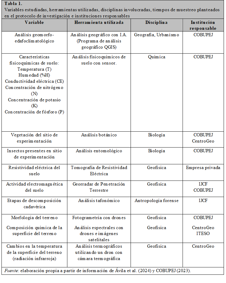 Para el desarrollo del protocolo se propuso un estudio longitudinal con duración de 1 año y 3 meses, y se planteó el uso de distintas herramientas de análisis para la obtención de información a partir de diversas disciplinas que estudiaran las características físicas, químicas y biológicas, en el sitio de experimentación, además de las etapas tafonómicas relacionadas con el proceso de descomposición de los sujetos de estudio, con el objetivo de poder correlacionar los distintos resultados que apoyan a la creación de esas nuevas técnicas y herramientas para la búsqueda (COBUPEJ, 2023; Ayala et al. 2024).